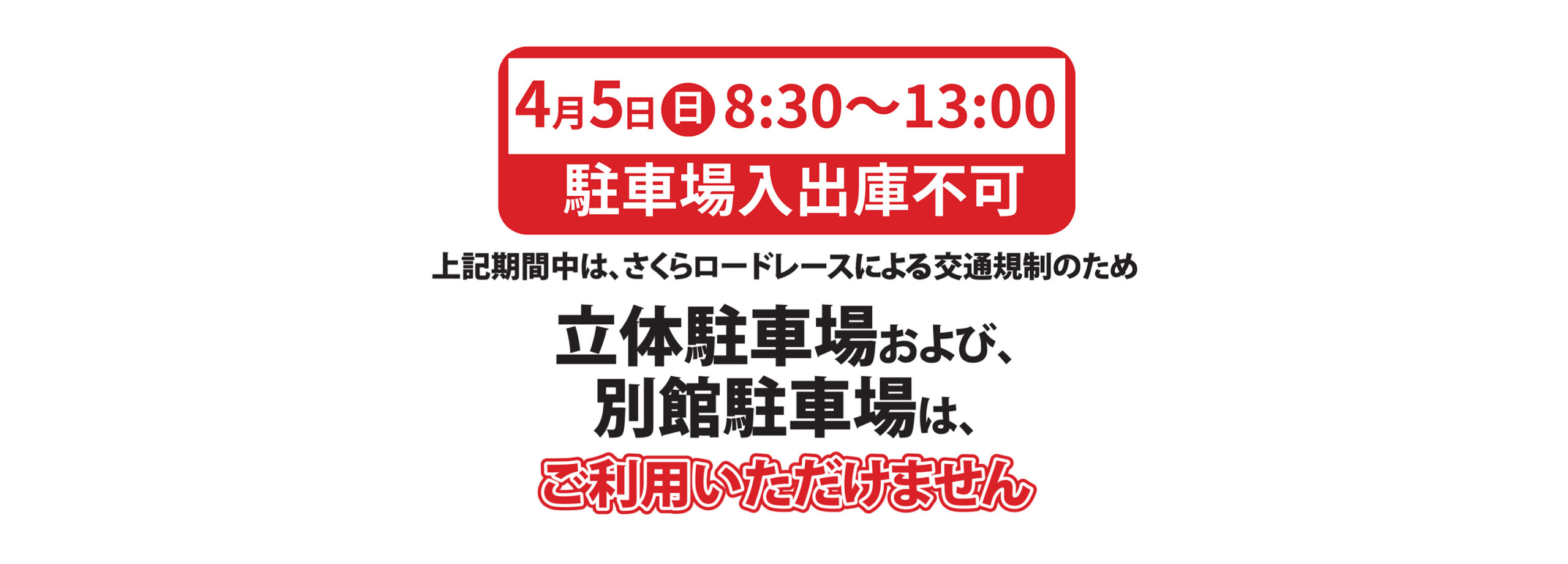 4月5日(日)8:30〜13:00駐車場入出庫不可