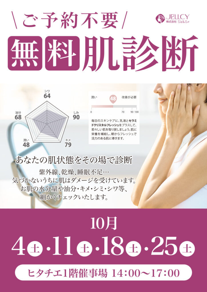 Jellcy 化粧品販売会【10月】 2025 9/30 ジェルシィ化粧品販売会10月開催分 無料肌診断開催! ■日時:4日(土)、11日(土)、18日(土)、25日(土)各日14:00〜17:00 ■会場:ヒタチエ1階催事場 ニュース&イベント